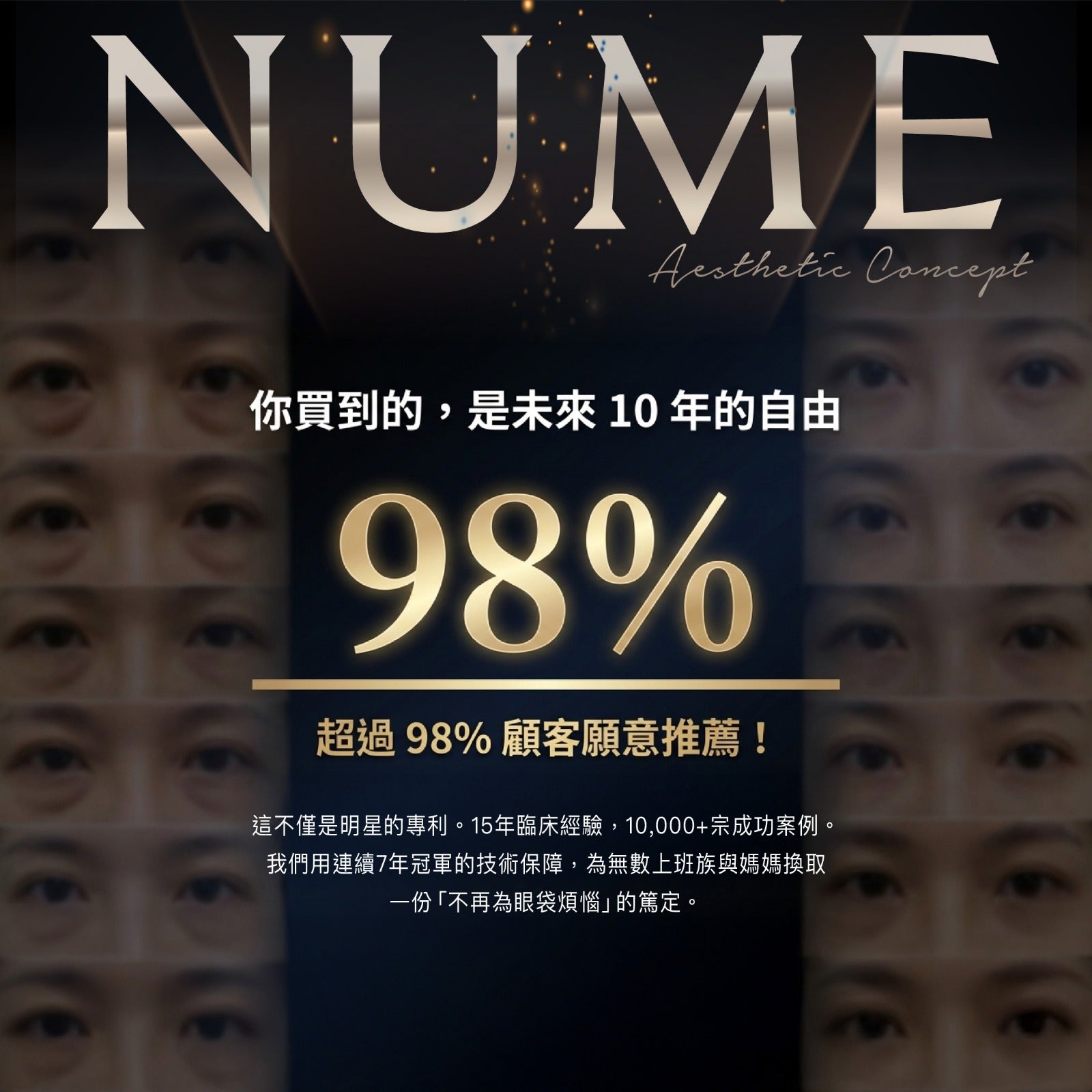 而是 NuMe 15年上萬次臨床經驗、瑞士尖端技術、連續7年冠軍保障,更是「未來10年不再為眼袋煩惱」的自由。